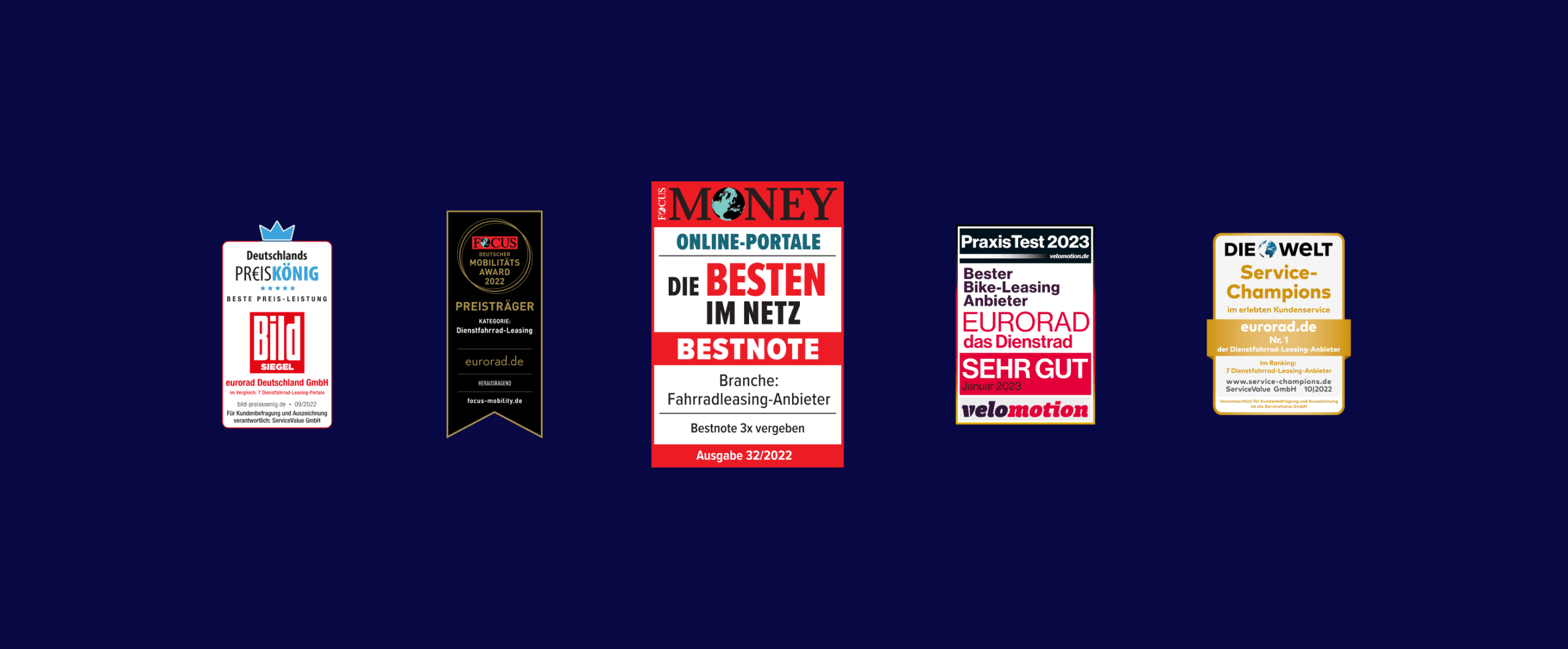 Auszeichnung für eurorad eurorad wurde von verschiedenen Testberichten als bester Bike-Leasing-Anbieter gekürt! Die Tageszeitung DIE WELT, das Magazin FOCUS MONEY mit dem Deutschland-Test und das Fahrrad-Magazin velomotion.de...